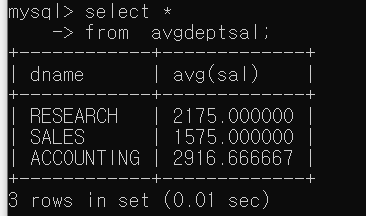 - 복잡한 쿼리를 단순화 (→ select * from avgdeptsal; 처럼 간단하게 조회 가능)