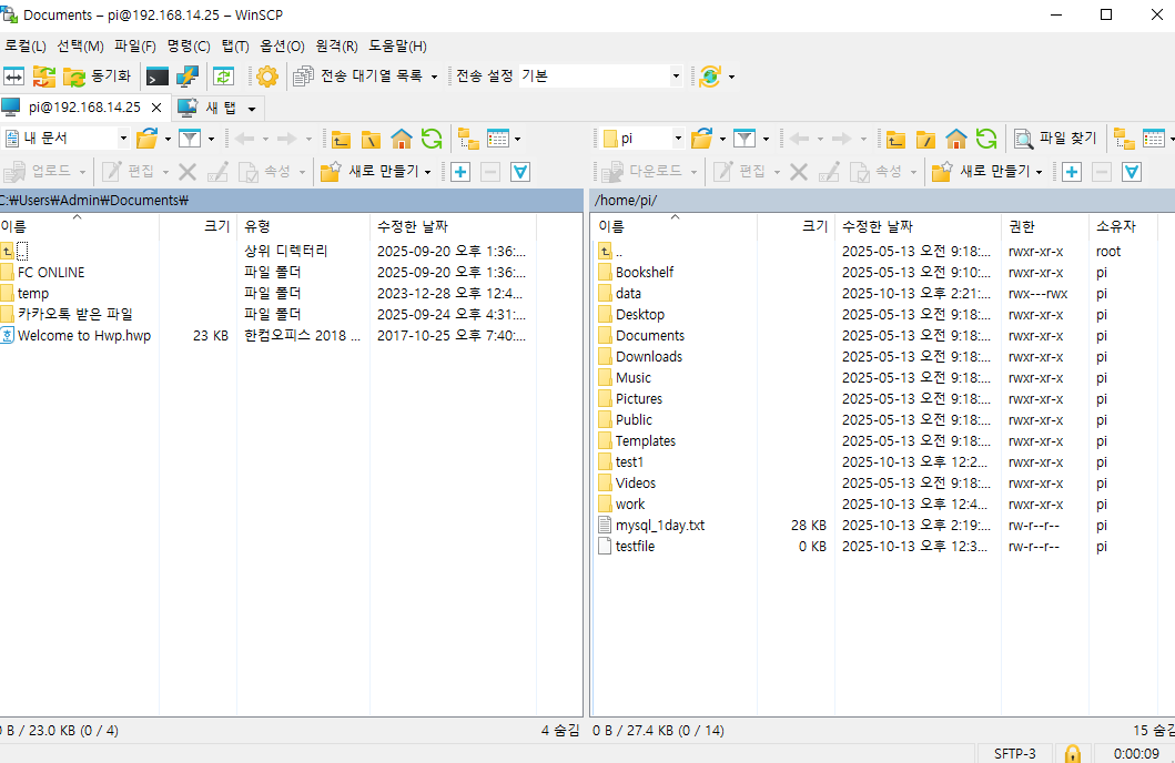 - 왼쪽은 윈도우(내 PC), 오른쪽은 라즈베리파이.